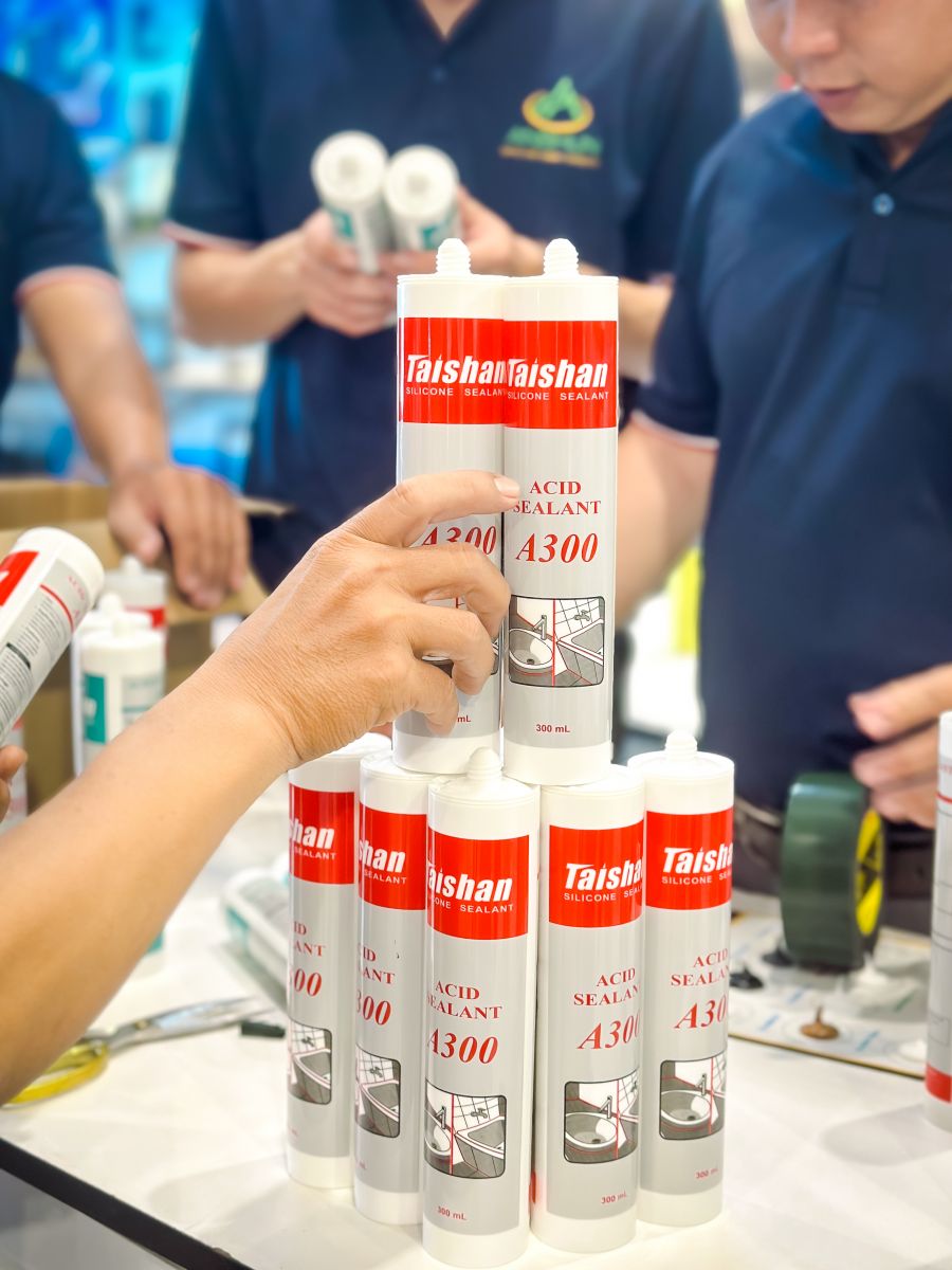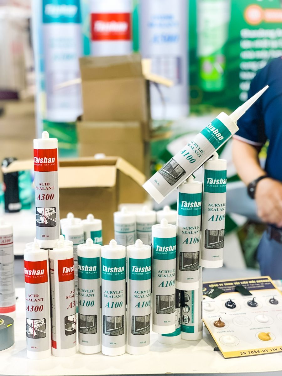 Đặc biệt, các sản phẩm như Taishan A300, A500, A100 và Bond 9800 đã được trưng bày và cho khách hàng trực tiếp trải nghiệm. Chất lượng vượt trội, độ bám dính cao và khả năng chống thấm hiệu quả đã nhận được nhiều phản hồi tích cực, khẳng định vị thế của Taishan trên thị trường keo silicone.