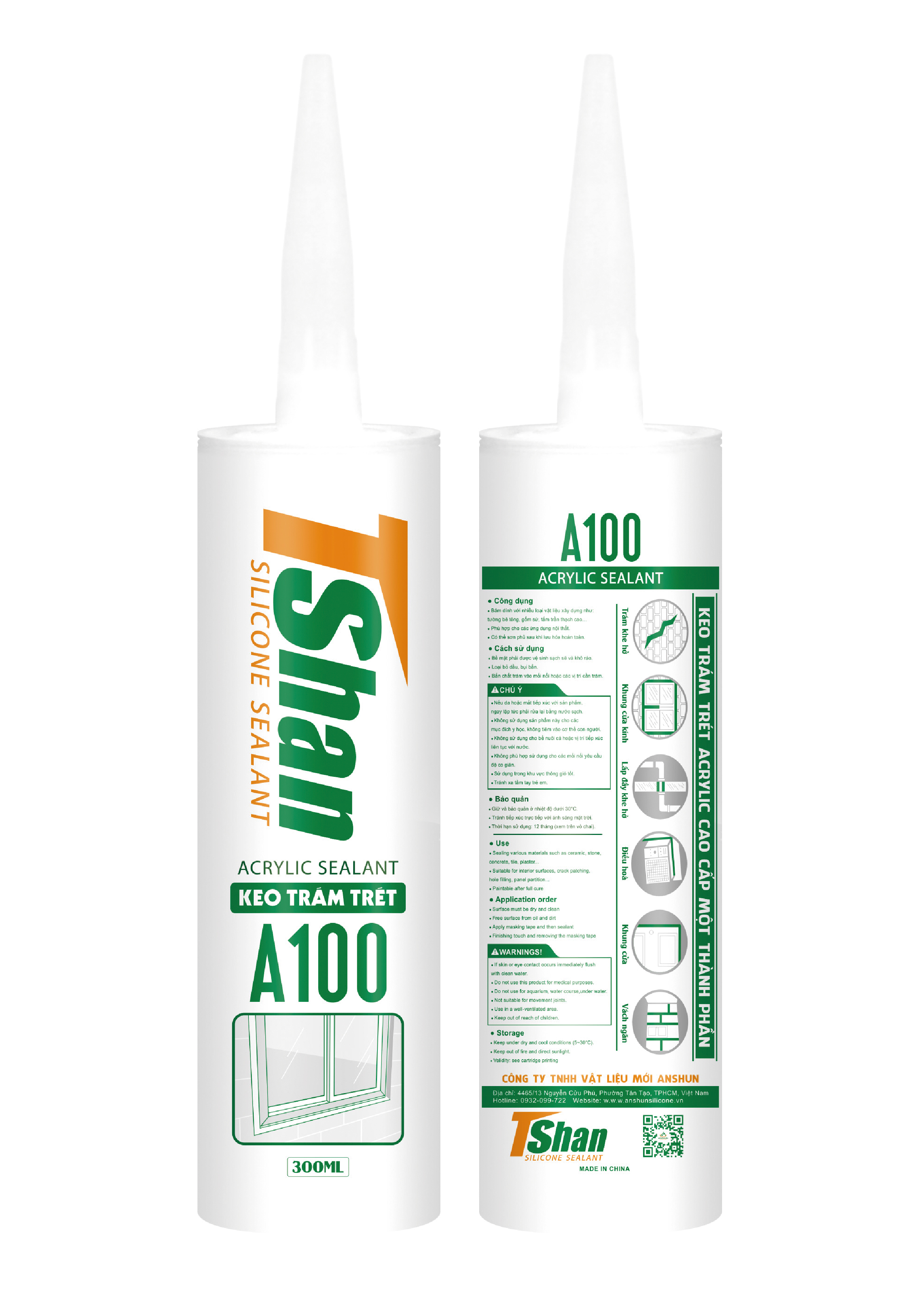 Keo Acrylic Taishan A100 được thiết kế đặc biệt cho việc trám các khe viền nội thất yêu cầu sự co giãn mối nối thấp, như các bề mặt: tường bê tông, bê tông bọt, thạch cao, tấm sợi xi măng, gạch, tấm trần thạch cao, nhôm, tấm PVC và gỗ,... Keo Acrylic A100 cũng được thiết kế cho việc trám đầy các khe hở cửa sổ, cửa đi, ông PVC, tầm trần, tường bê tông khô. Ngoài ra nó cũng được sử dụng cho các vết nứt nội thất (không sử dụng trong môi trường ẩm ướt, có nước)